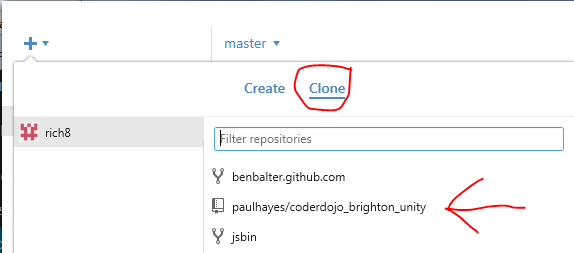 - Clone the coderdojo_brighton_unity repository into your github folder (created by the github client in my docs)